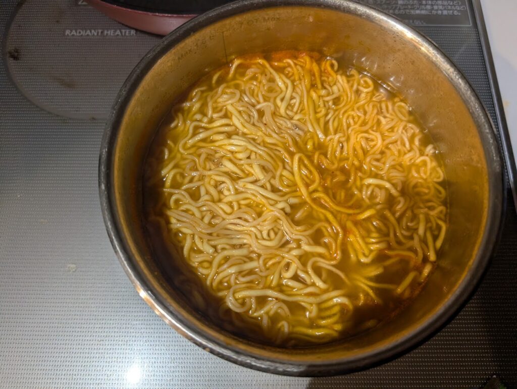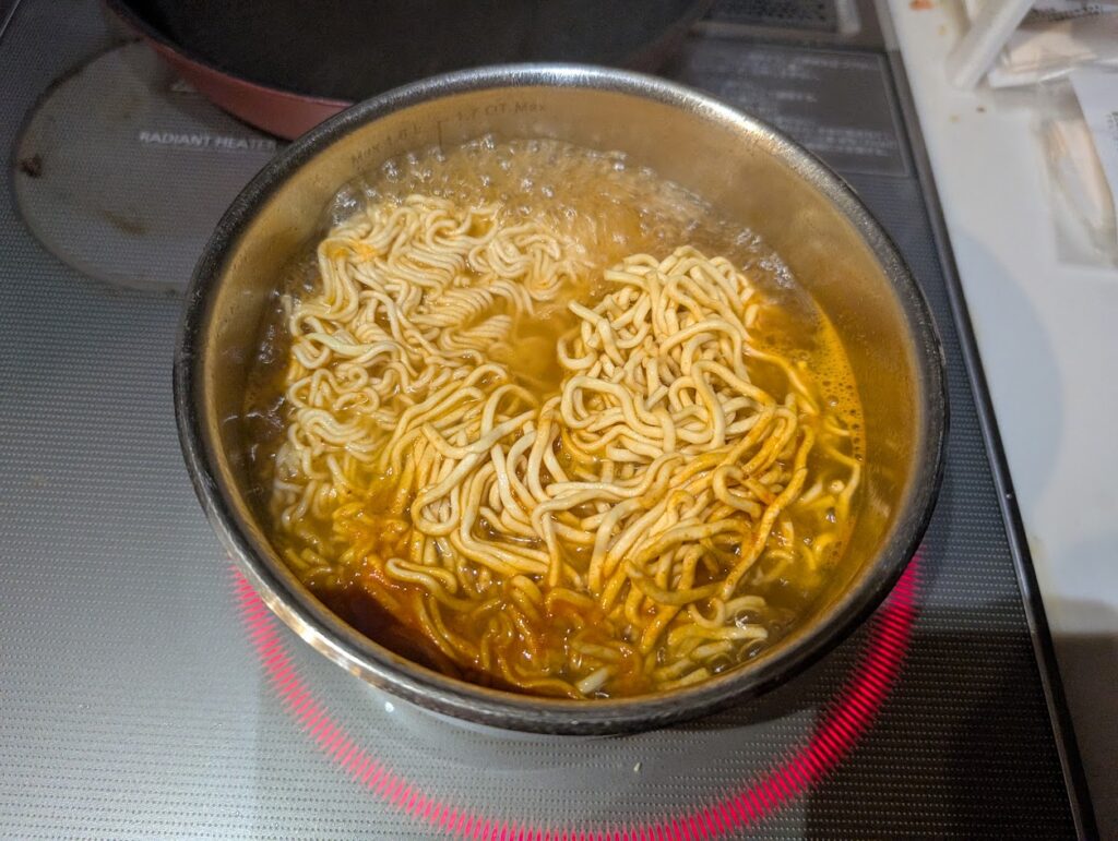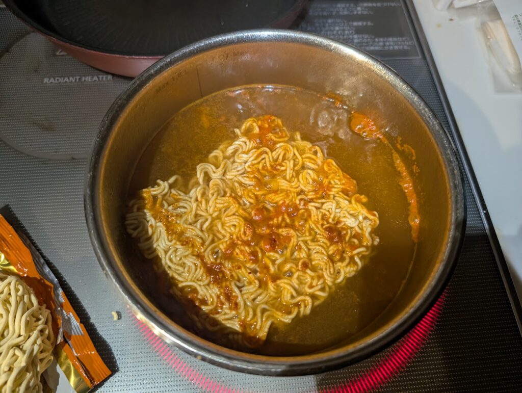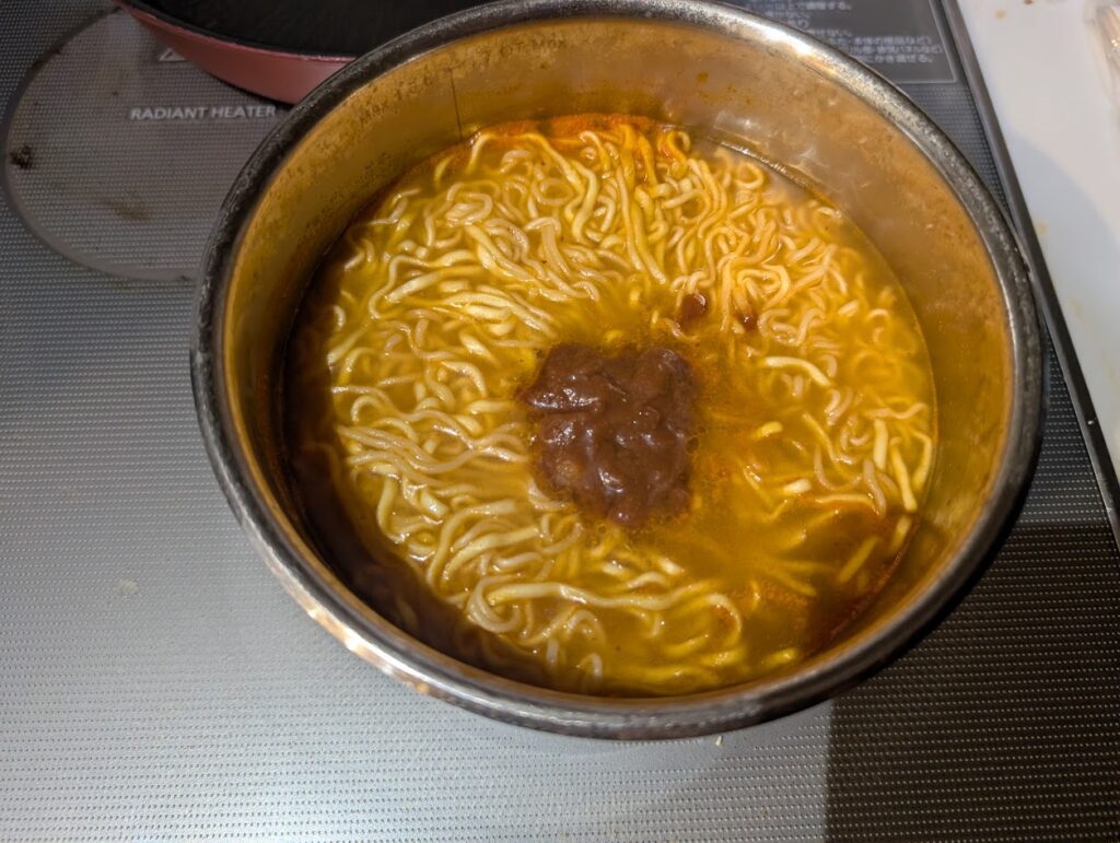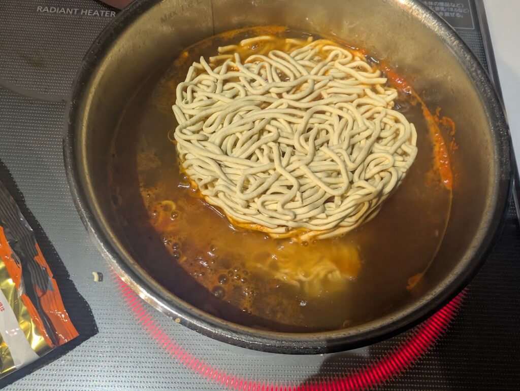 宮崎辛麺の粉末スープをいれて沸騰させます。